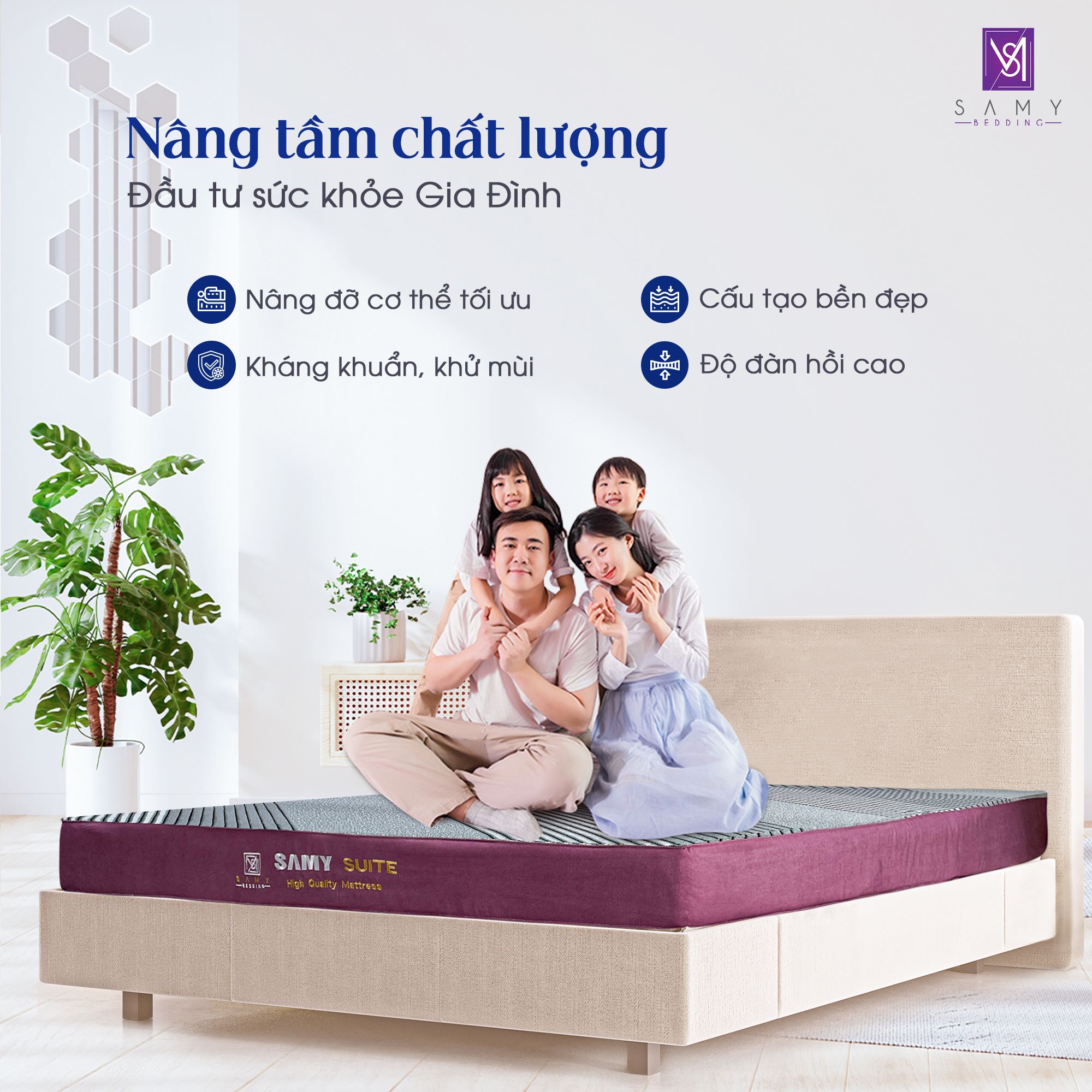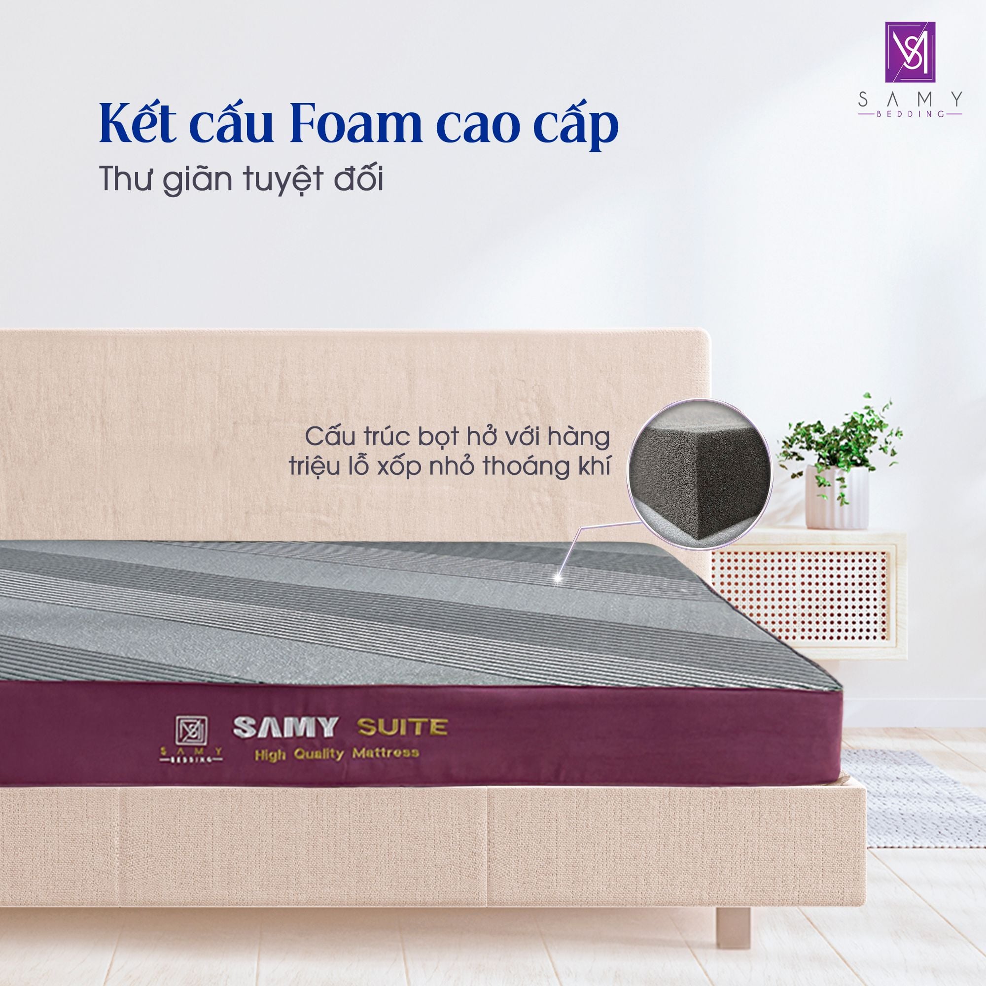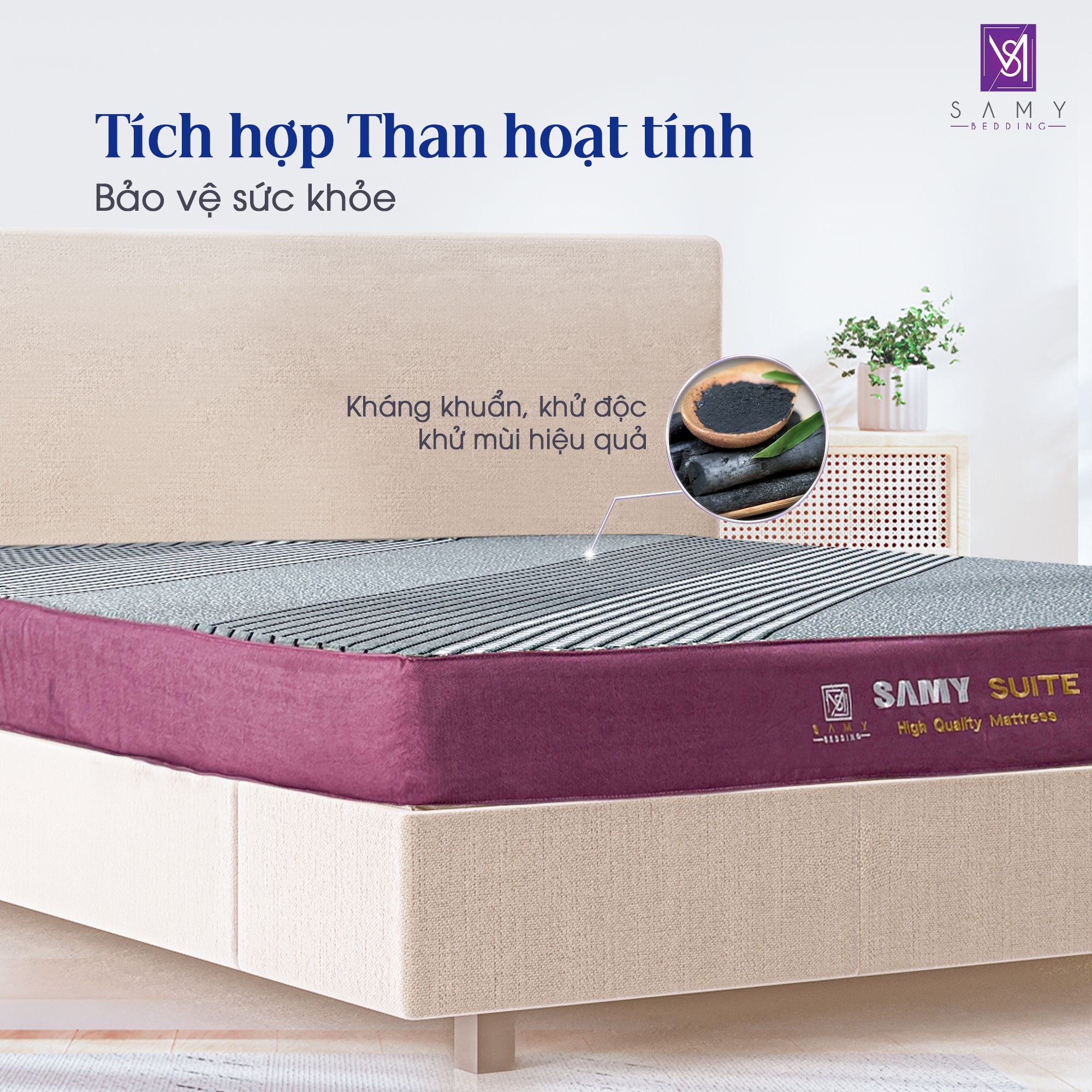 Nệm foam than hoạt tính cao cấp Samy Suite: Sự kết hợp hoàn hảo giữa foam cao cấp và than hoạt tính, mang đến giấc ngủ sâu, khỏe mạnh, bảo vệ bạn và gia đình khỏi vi khuẩn và mùi hôi khó chịu.