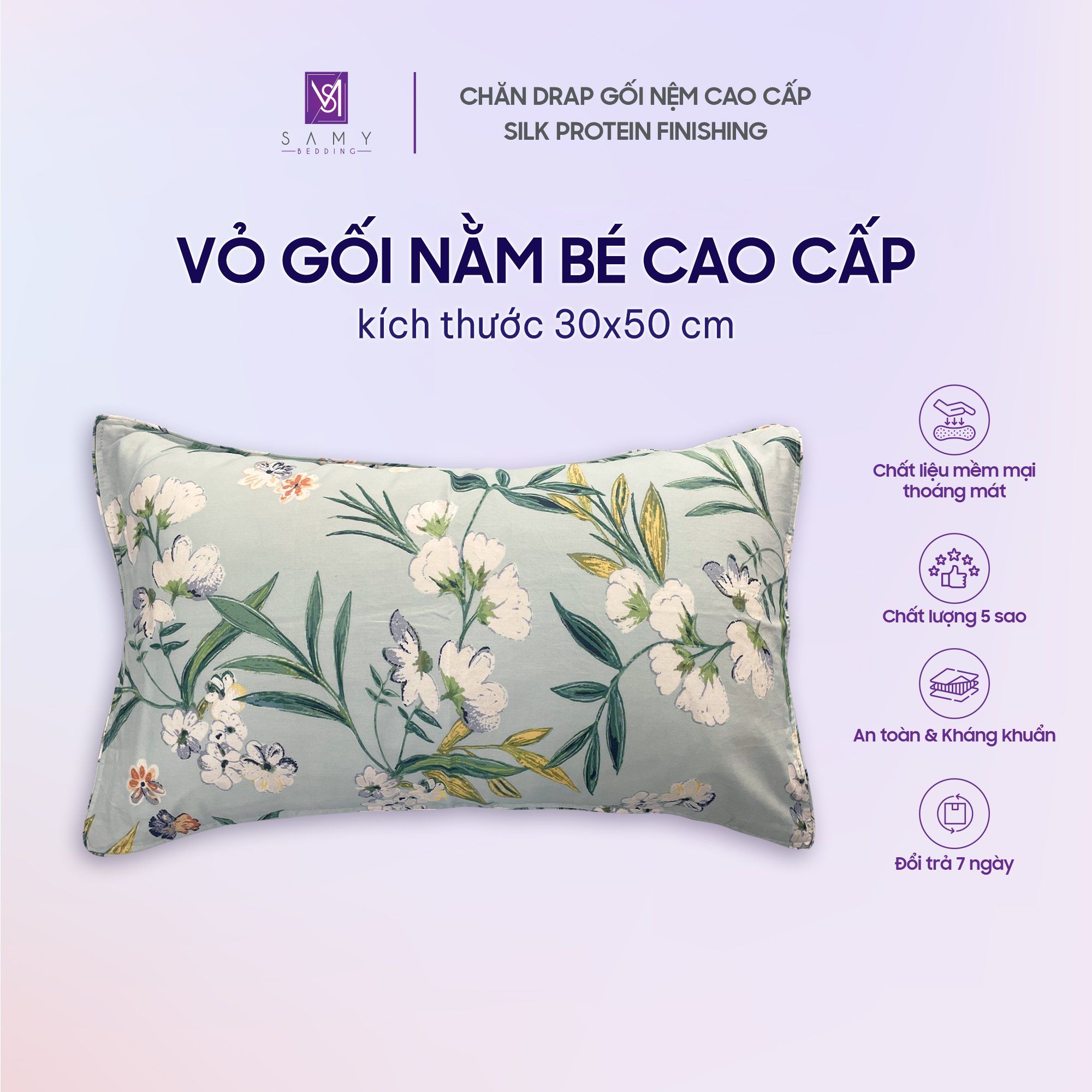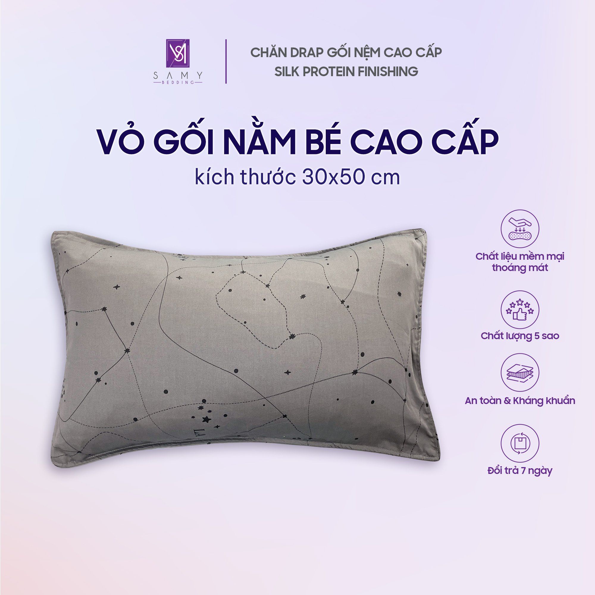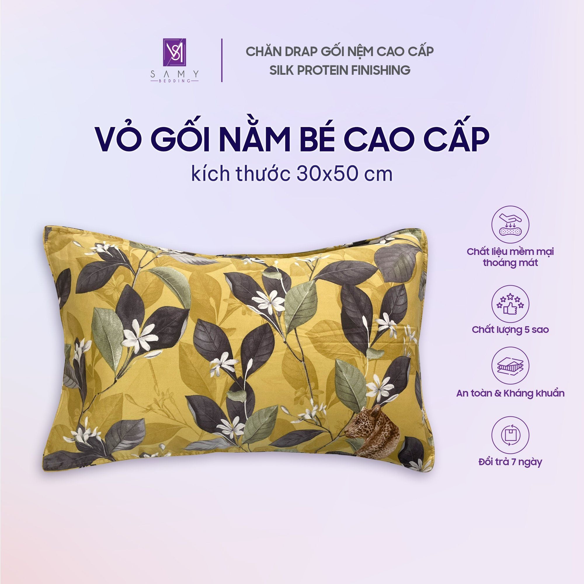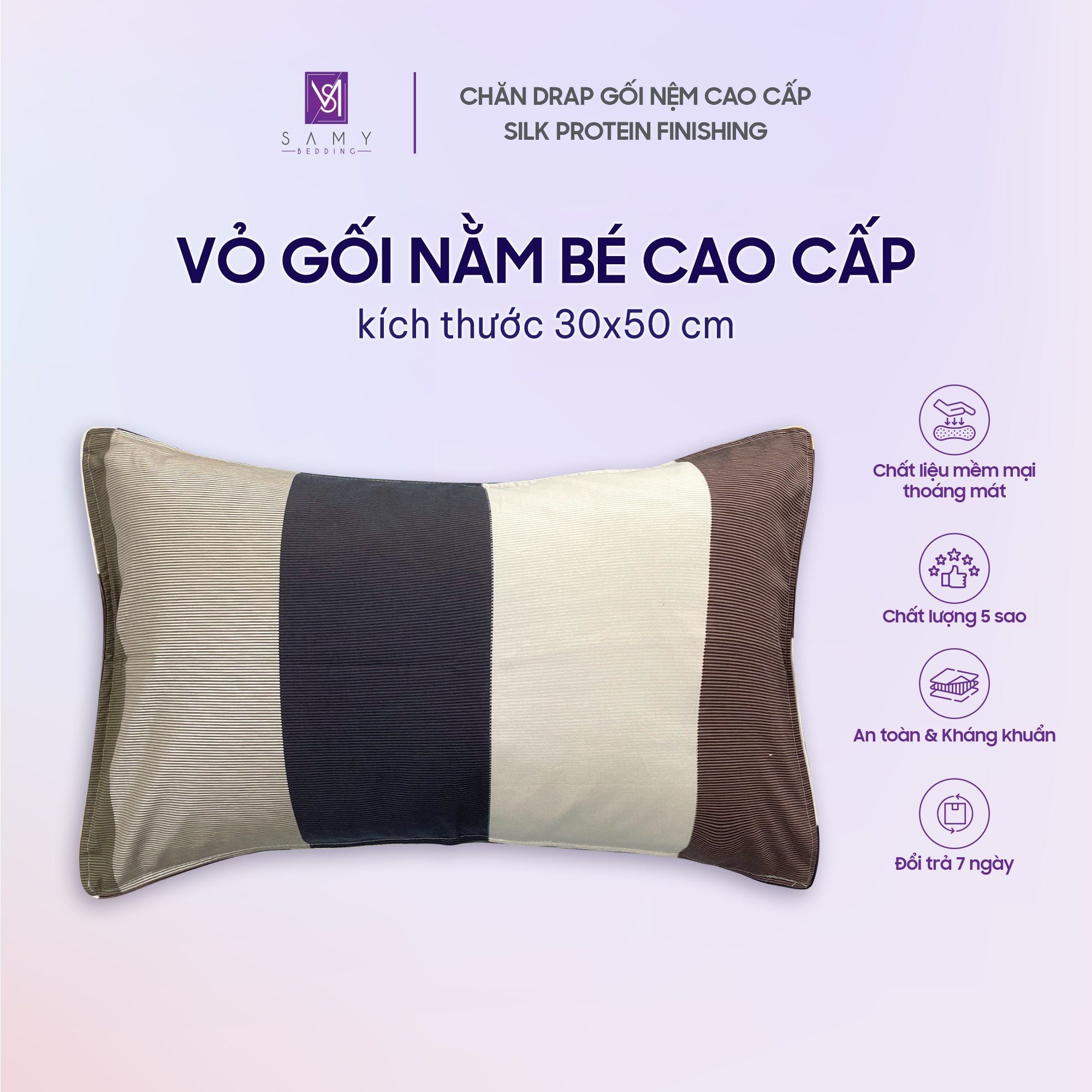- VỎ GỐI NẰM BÉ CAO CẤP Siêu mát mịn, thoáng khí mềm mại. Hoàn tất vải Silk Protein Finishing tăng độ bóng mượt và độ bền, chống nhăn và dễ dàng vệ sinh.